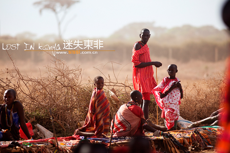 下一个环节是带我们去马赛人的小市场,就在村子后面,一片空地上,数十个马赛妇女在路两边摆着地摊。马赛导游说,我们看到合适的尽管拿,然后出去结账。两边的妇人不停地向我们推销东西,我们来之前完全没有购物的计划,只能一次一次的婉拒,然后看到她们失望的表情,这让我和小宝不知所措。